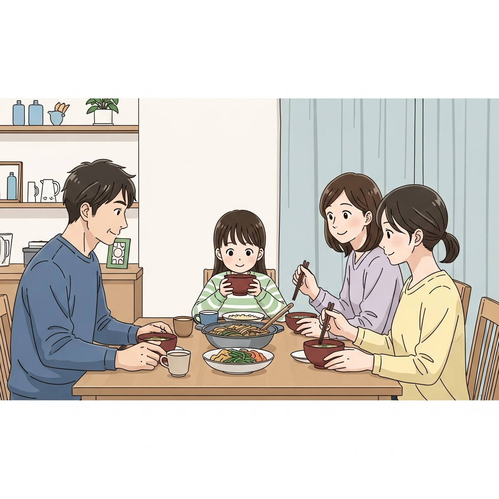 家族四人が席についた。誰も特別なことを言わない。「いただきます」の声が重なって、箸が動きはじめる。それだけのことなのに、なんだか安心する。