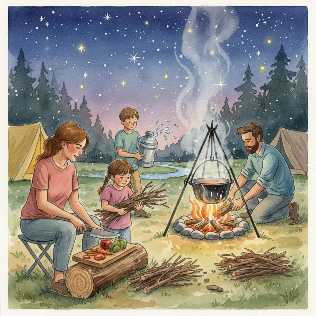 キャンプにおける料理は、日常の台所仕事とはまったく異なる体験だ。限られた道具と食材、そして自然という大きな舞台の中で、家族それぞれの創意工夫が試される。妻は前日から準備していた野菜を取り出し、娘は薪を集め、息子は水を汲みに行く。私は焚き火台の前で火加減を調整しながら、この静かな連携プレーに心地よさを感じていた。