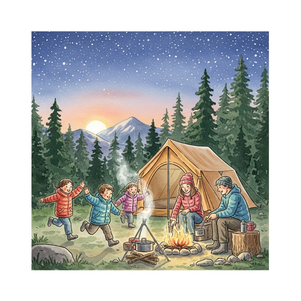 テントを張り終えた頃、空はまだ明るかった。標高の高いキャンプ場は夕方になると気温がぐっと下がり、息をするたびに白いものが混じりはじめる。子どもたちは早々に上着を引っ張り出して、それでもはしゃいで走り回っていた。