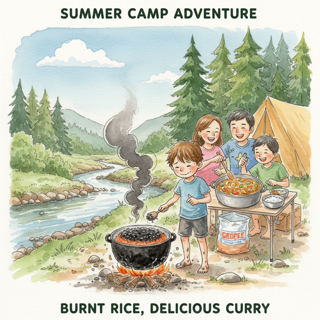 カレーは意外とちゃんと美味しくできてた。長女が「私が作ったからね」って得意げで、次男が「俺も肉切った」って言い返して、いつもの感じ。焦げたご飯は記念に写真だけ撮って、あとで炭と一緒に処分した。