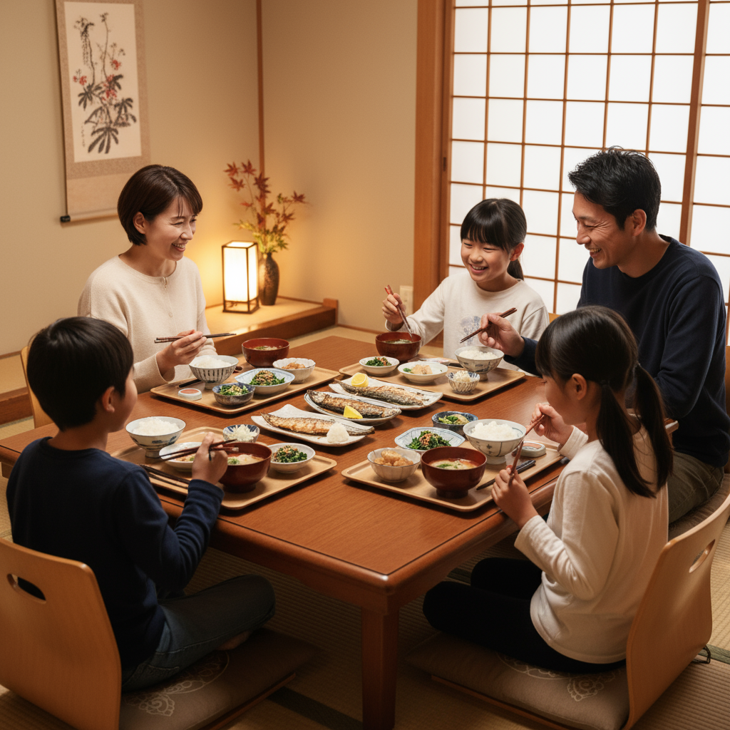 窓から差し込む夕暮れの柔らかな光が、食卓を優しく照らしています。湯気の立つ味噌汁の香りが部屋いっぱいに広がり、家族それぞれの一日の疲れを癒やしていくようです。私たち家族の夕食時間は、いつもこんな穏やかな空気に包まれています。