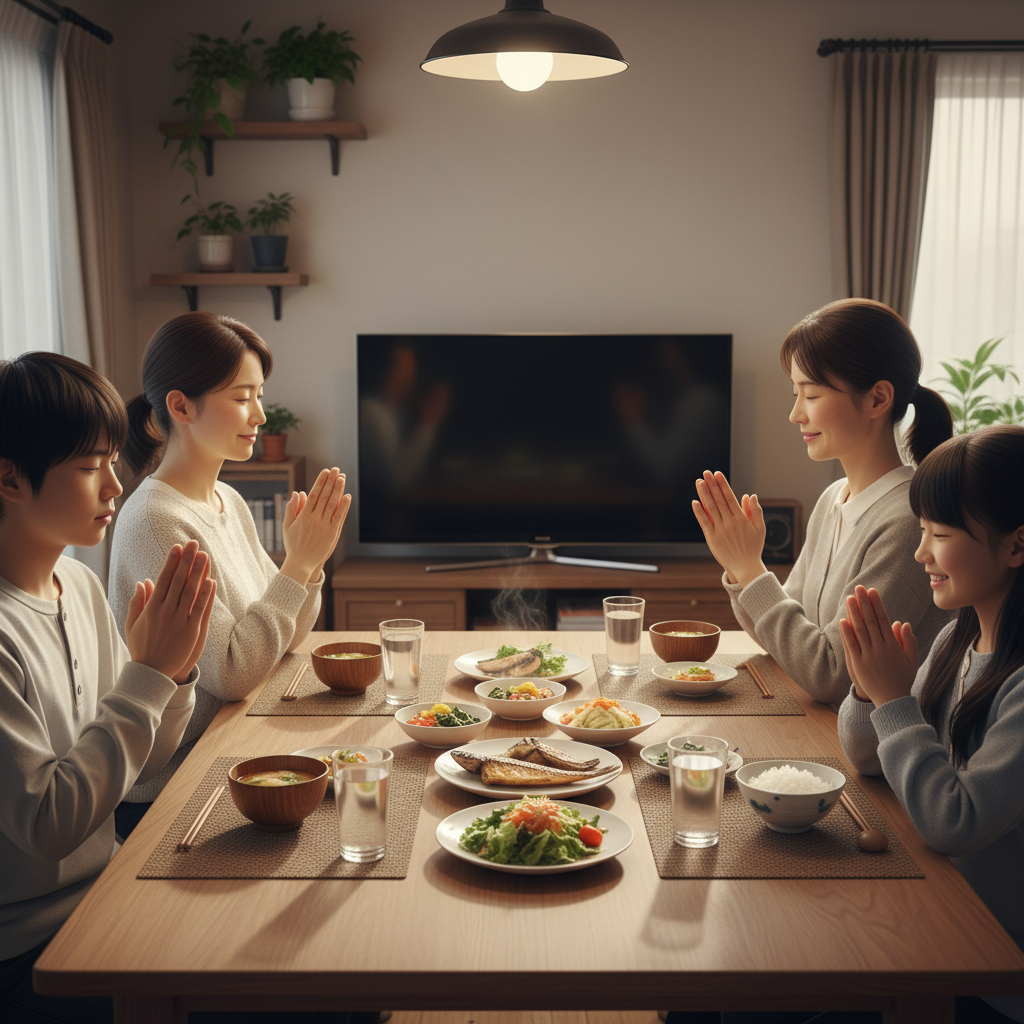 母が最後の小鉢を並べ終えて、エプロンを外して椅子に座る。父が新聞を畳む音がして、妹がやっと部屋から降りてくる。全員が揃ってから「いただきます」。その瞬間まで、誰も料理に手を伸ばさない。冬の夜だと湯気がもう少し弱くなっていて、母が「冷めちゃうから早く座りなさい」って急かす声だけが響く。