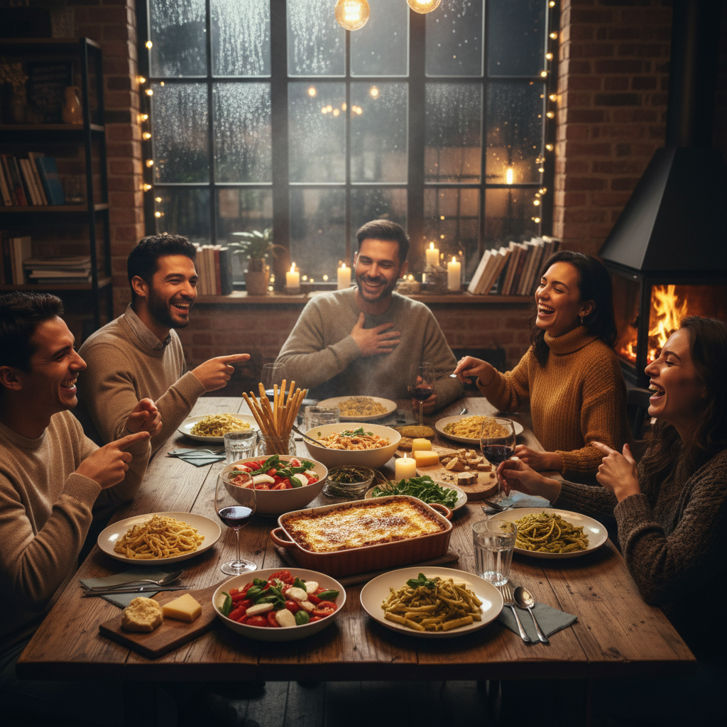 友人たちが集まる夜というのは、いつも思いがけない瞬間に満ちている。今回もそうだった。十一月の終わり、窓の外には冷たい雨が降っていて、部屋の中は逆に温かく、料理の香りが立ち込めていた。テーブルには誰かが持ち寄ったイタリアンの大皿が並び、トマトとバジルの香りがオリーブオイルの甘さと混ざり合って、空間全体を柔らかく包んでいる。