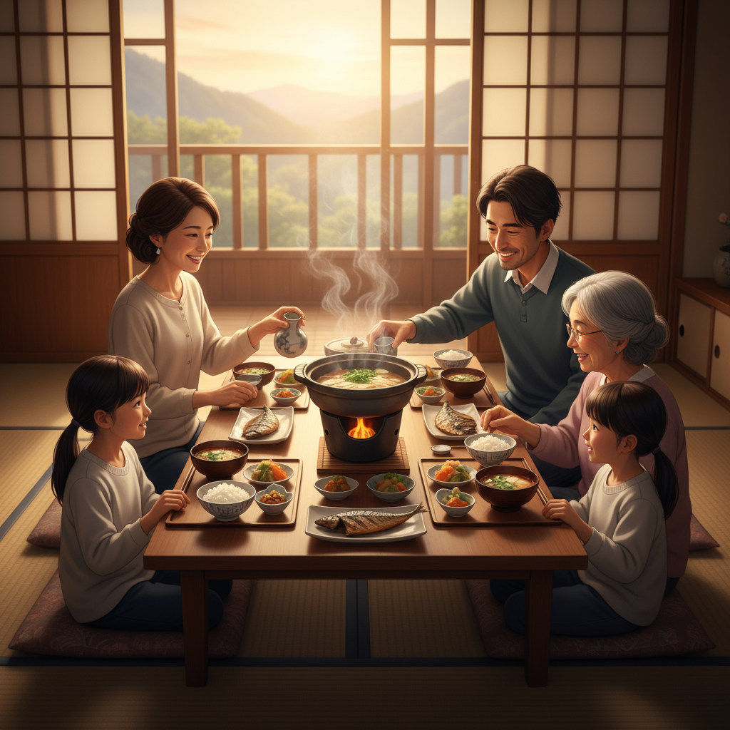 日本料理は単なる食事ではなく、季節を感じ、素材を慈しみ、作り手の心を受け取る文化そのものです。白いご飯の湯気、味噌汁の温かさ、焼き魚の香ばしさ、煮物の優しい甘み。これらひとつひとつが、家族の健康を願う母の愛情であり、家族を支える父の労働の対価であり、子どもたちの成長を見守る祖父母の祈りでもあります。食卓を囲むという行為は、ただお腹を満たすためだけではなく、家族という小さな共同体が心を通わせる大切な儀式なのです。