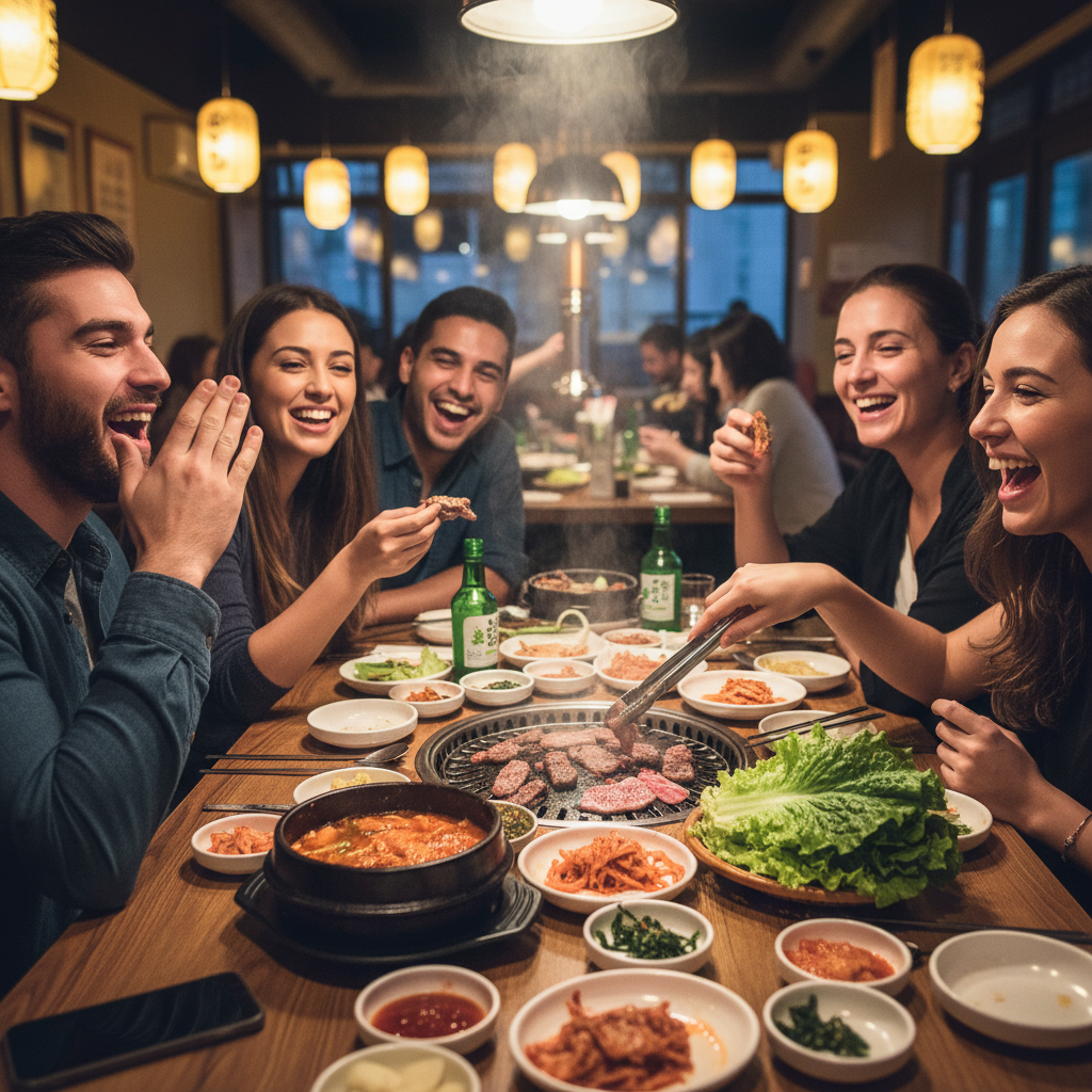 韓国料理の最大の魅力は、そのシェアしやすさと、みんなで囲む楽しさにあります。チゲ鍋やサムギョプサル、チーズタッカルビなど、大皿で提供される料理が多く、自然と会話が弾み、笑顔が溢れる空間が生まれます。一人で静かに味わう料理とは違い、韓国料理は「みんなで食べる」ことを前提としたスタイルが多いため、友人たちとの集まりには最適なのです。